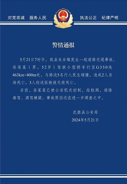 央視網(wǎng)消息:據(jù)平安武勝微信公眾號(hào)消息,5月21日7時(shí)許,武勝縣龍女鎮(zhèn)發(fā)生一起道路交通事故,孫某某(男,52歲)駕駛小型轎車行至G350線463km+400m處,與路邊5名行人發(fā)生碰撞,造成2人當(dāng)場(chǎng)死亡,3人經(jīng)送醫(yī)搶救無(wú)效死亡。目前,孫某某已被公安機(jī)關(guān)控制,經(jīng)檢測(cè),排除毒駕、酒駕嫌疑。事故原因還在進(jìn)一步調(diào)查之中。