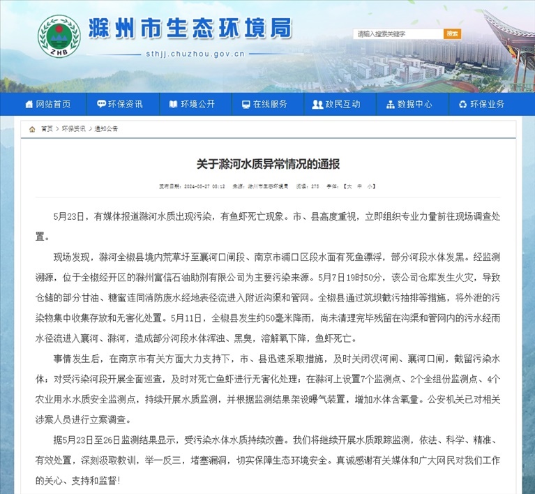 現(xiàn)場發(fā)現(xiàn),滁河全椒縣境內荒草圩至襄河口閘段、南京市浦口區(qū)段水面有死魚漂浮,部分河段水體發(fā)黑。經監(jiān)測溯源,位于全椒經開區(qū)的滁州富信石油助劑有限公司為主要污染來源。5月7日19時50分,該公司倉庫發(fā)生火災,導致倉儲的部分甘油、糖蜜連同消防廢水經地表徑流進入附近溝渠和管網。全椒縣通過筑壩截污抽排等措施,將外泄的污染物集中收集存放和無害化處置。5月11日,全椒縣發(fā)生約50毫米降雨,尚未清理完畢殘留在溝渠和管網內的污水經雨水徑流進入襄河、滁河,造成部分河段水體渾濁、黑臭,溶解氧下降,魚蝦死亡。公安機關已對相關涉案人員進行立案調查。