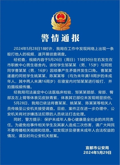 ·湖北宜都警方通報男生遭多名同學毆打并被拍視頻。