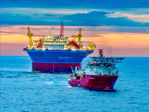 ·我國自主設計建造的亞洲首艘圓筒型“海上油氣加工廠”——“??惶枴边\抵作業(yè)海域。