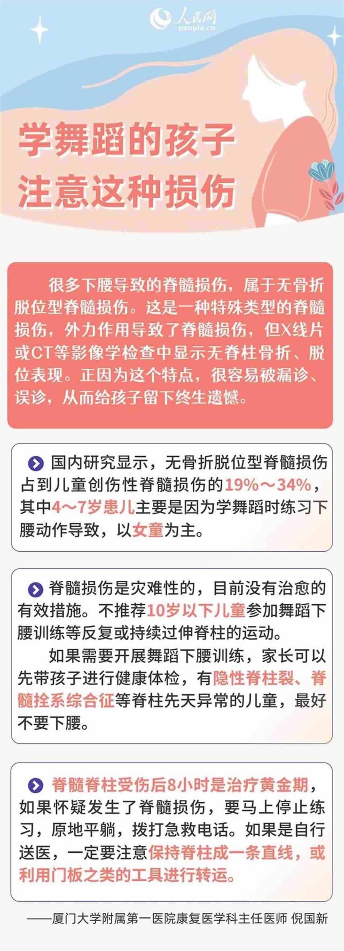 廈門大學(xué)附屬第一醫(yī)院康復(fù)醫(yī)學(xué)科主任醫(yī)師倪國新對記者表示,兒童練習(xí)舞蹈雖然好處多多,但需要注意的是,下腰、壓腿等動作存在一定的危險性,嚴(yán)重的甚至?xí)?dǎo)致截癱,在練習(xí)過程中要謹(jǐn)防脊髓損傷。