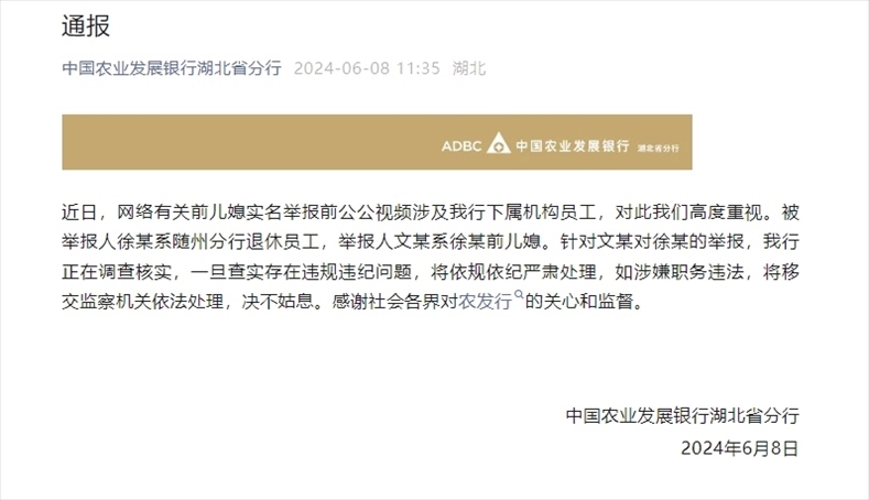 ·農(nóng)發(fā)行湖北分行通報“女子實名舉報前公公”:正調(diào)查核實。