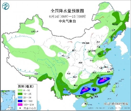 圖4 全國降水量預(yù)報圖(6月14日08時-15日08時)