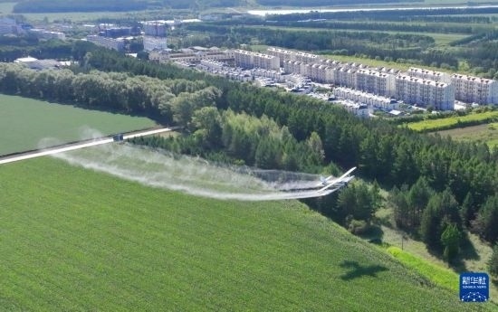 8月2日,農(nóng)用飛機(jī)在北大荒集團(tuán)黑龍江尖山農(nóng)場(chǎng)有限公司農(nóng)業(yè)科技服務(wù)中心玉米田噴施葉面肥(無(wú)人機(jī)照片)。