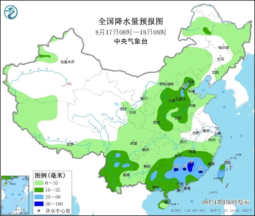 未來三天,江南南部、華南及四川盆地等地部分地區(qū)有分散性強降雨,并伴有強對流天氣,降雨強度大;西北地區(qū)東部、內(nèi)蒙古、華北、東北地區(qū)、黃淮等地有一次降雨過程,青海、甘肅、寧夏、陜西等地部分地區(qū)已出現(xiàn)較強降雨,需防范持續(xù)降雨和局地短時強降雨可能引發(fā)的次生災(zāi)害。由于副熱帶高壓減弱和降雨鋪展,高溫明顯減弱。高溫主要集中在四川盆地,湖北、湖南、浙江、江蘇等地雖有高溫,但范圍較小。