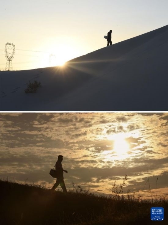 拼版照片:上圖為2018年1月25日,梁春榮出診時(shí)行走在“沙坨子”里;下圖為2024年8月13日,梁春榮在出診路上,曾經(jīng)翻越的“沙坨子”如今已是草地。