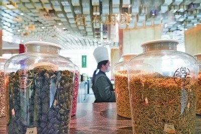 北京同仁堂知嘛健康零號店餐廳內擺放的草本食材。新華社發(fā)