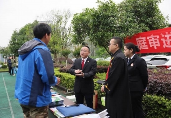 圖為重慶市渝北區(qū)人民法院在一起到企業(yè)現(xiàn)場開庭的勞動(dòng)爭議案結(jié)束后,為勞動(dòng)者普及法律知識、提供法律咨詢。 劉霞 攝