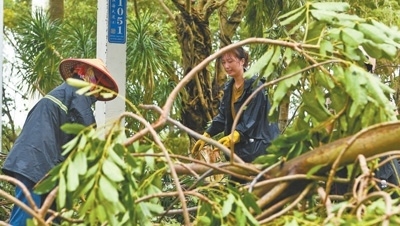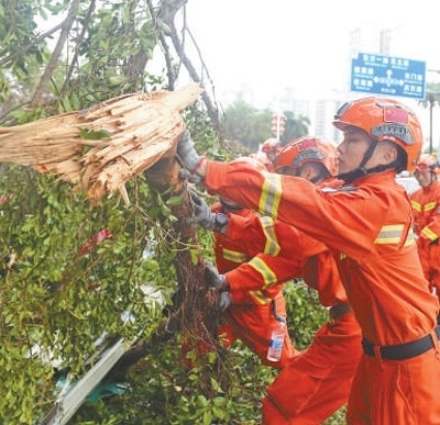 9月7日,海南省??谑泄ぷ魅藛T在海口市濱海大道上清理被風(fēng)吹倒的樹木。新華社記者 楊冠宇攝