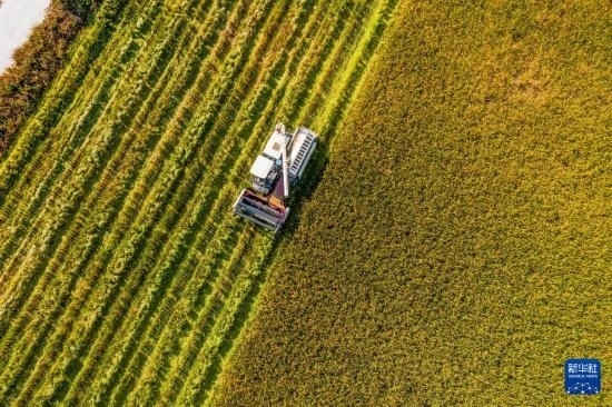 10月25日,收割機(jī)在東林鎮(zhèn)保國村的稻田里作業(yè)(無人機(jī)照片)。