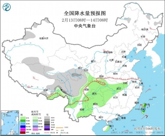 全國降水量預(yù)報(bào)圖(2月13日08時(shí)-14日08時(shí)) 圖片來源:中央氣象臺網(wǎng)站