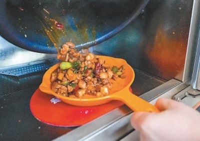 劉楊化身“主人公”,開始了“一肩挑”的演示:觸摸屏上勾選心儀菜品,手機掃碼支付,冷柜取出對應(yīng)號碼的配菜盒,打開密封包裝,加入佐料包,將配菜盒整體放入炒菜機器人,然后選擇相應(yīng)的炒菜程序。
