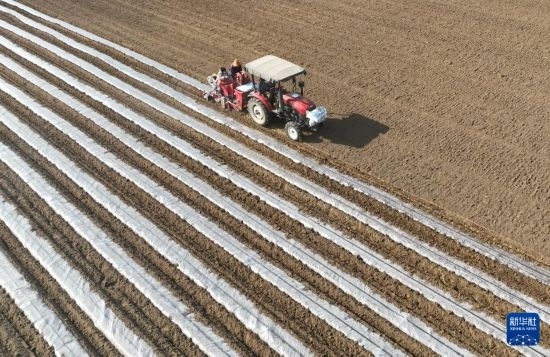 2月26日,河北省新樂(lè)市東王鎮(zhèn)的農(nóng)民使用農(nóng)機(jī)播種馬鈴薯(無(wú)人機(jī)照片)。