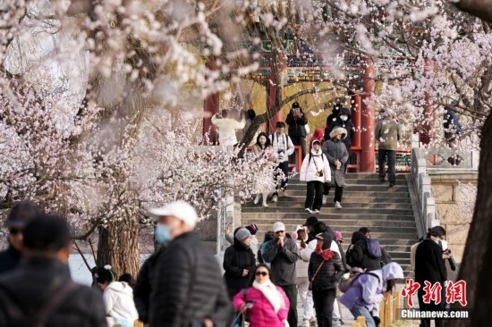 3月17日,游客在北京頤和園西堤賞花。近日,北京頤和園西堤山桃花進入最佳觀賞期,吸引眾多游客前往賞花。