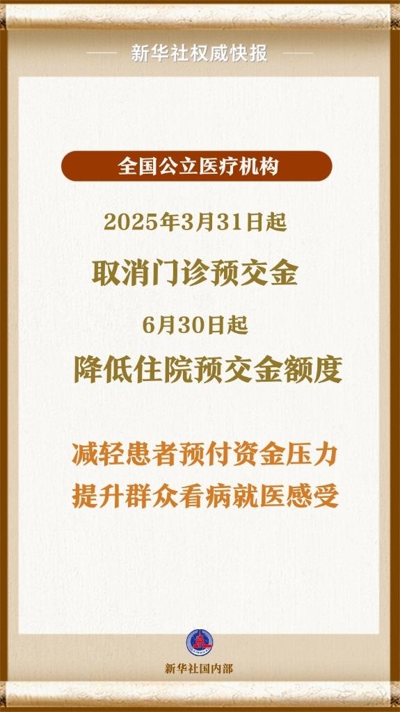 國家衛(wèi)生健康委、財(cái)政部、國家醫(yī)保局等6部門日前聯(lián)合印發(fā)《關(guān)于規(guī)范公立醫(yī)療機(jī)構(gòu)預(yù)交金管理工作的通知》,要求公立醫(yī)療機(jī)構(gòu)自2025年3月31日起全面停止收取門診預(yù)交金,自2025年6月30日起降低住院預(yù)交金額度。