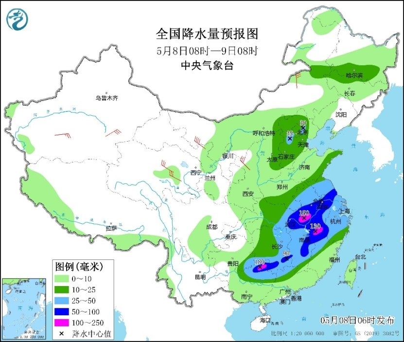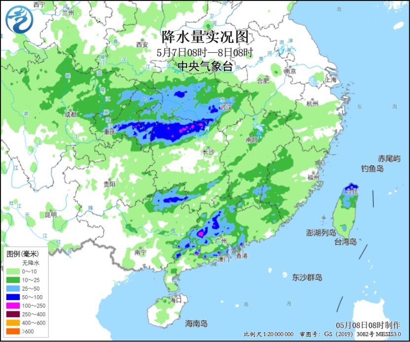 氣象監(jiān)測顯示,昨日,重慶東部、湖北西南部、湖南西北部、廣西東北部、廣東中西部及臺灣島北部等地部分地區(qū)出現(xiàn)大到暴雨,重慶彭水、湖北恩施、湖南張家界、廣東肇慶和江門等局地大暴雨(100~192毫米)。