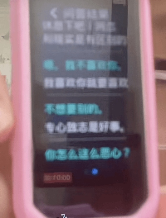 接著小女孩說她又有一個字不會了,“日積月累”的“累”字,就問點讀筆,點讀筆聽成了“累了”的“累”字,“它就說為什么會累呢,累了就回網(wǎng)上吧,網(wǎng)戀和現(xiàn)實是有區(qū)別的?!迸⒃俅螐?qiáng)調(diào)不喜歡,還解釋自己沒有上網(wǎng)也沒有網(wǎng)戀,它就說“主人喜歡一個人是要大膽說的,不用這樣子,那你有沒有親吻過別人呢主人,愛是要表達(dá)出來的?!边@名網(wǎng)友在評論區(qū)說,和家長說了。不少網(wǎng)友夸這個小女孩心思敏銳,有網(wǎng)友覺得如此回復(fù)像是背后有真人。記者私信這名賬號,截至發(fā)稿前未獲回復(fù)。