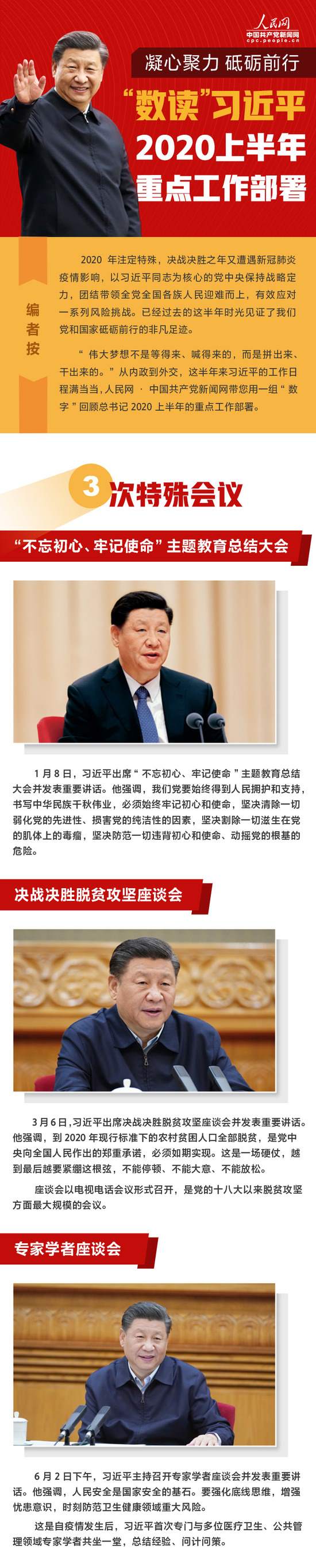 細(xì)數(shù)今年上半年,習(xí)近平夙夜在公,勤勉工作,不斷刷新“忙碌指數(shù)”:數(shù)十次出席重要會(huì)議部署各項(xiàng)工作,8次國(guó)內(nèi)考察,調(diào)研足跡遍及7省區(qū)市,3次出席國(guó)際重要會(huì)議并發(fā)表講話,20余次致信、回信海內(nèi)外人士,60次就疫情防控等話題與40余位外國(guó)政要和國(guó)際組織負(fù)責(zé)人通電話……人民網(wǎng)·中國(guó)共產(chǎn)黨新聞網(wǎng)推出系列圖解報(bào)道,帶您全方面回顧習(xí)近平的2020上半年。