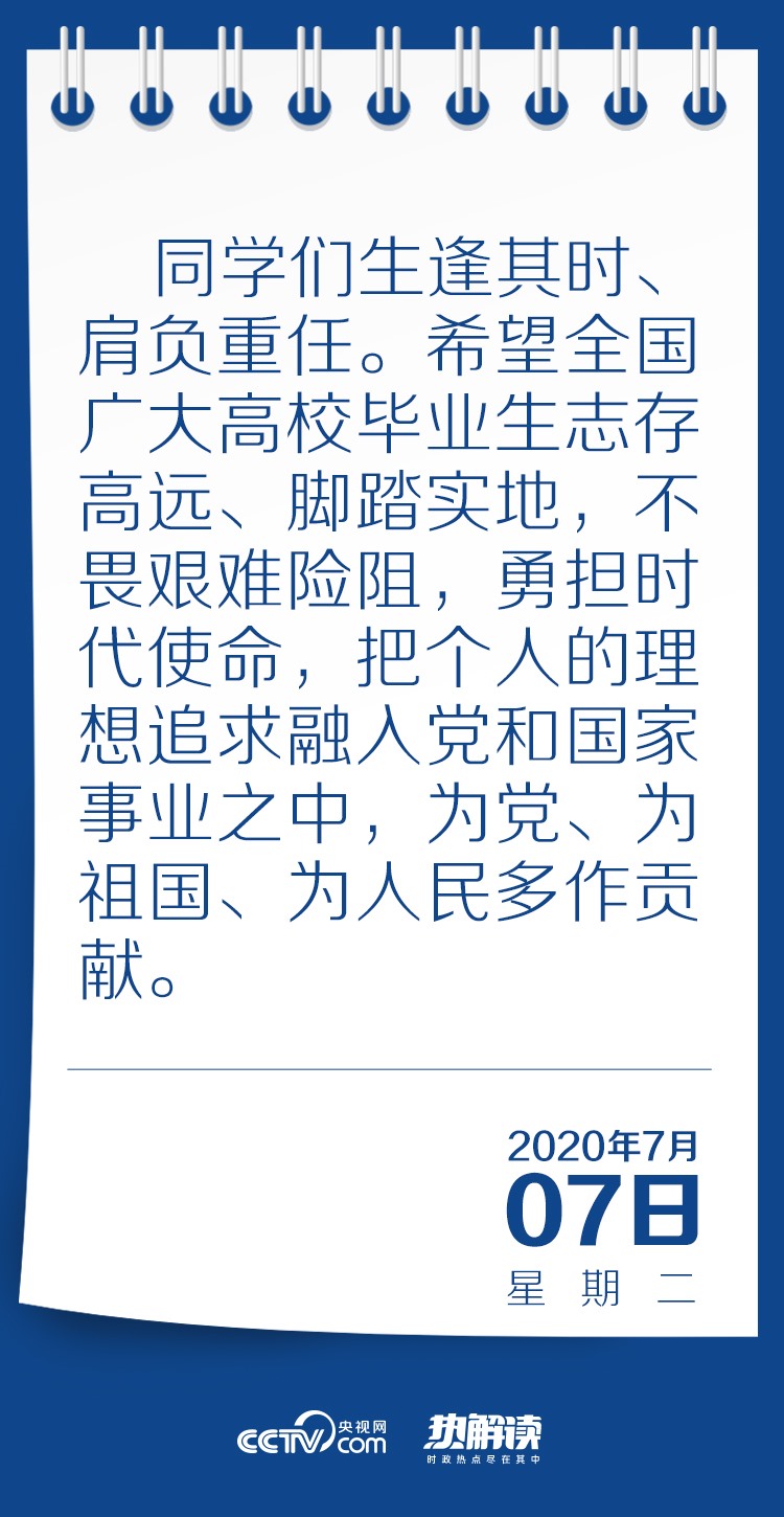 習(xí)近平總書記在回信中高度肯定了同學(xué)們到邊疆基層工作的選擇,并對(duì)廣大高校畢業(yè)生提出殷切期望:“希望全國廣大高校畢業(yè)生志存高遠(yuǎn)、腳踏實(shí)地,不畏艱難險(xiǎn)阻,勇?lián)鷷r(shí)代使命,把個(gè)人的理想追求融入黨和國家事業(yè)之中,為黨、為祖國、為人民多作貢獻(xiàn)?!?/p>
