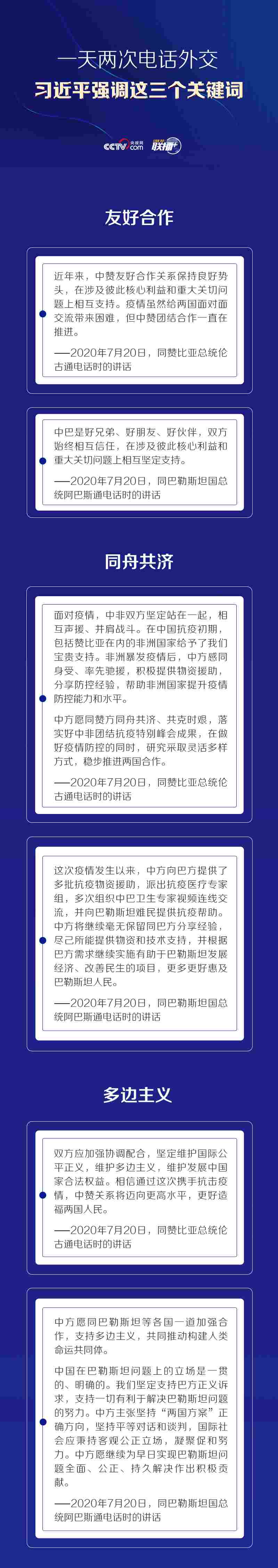 7月20日晚,習(xí)近平主席分別同贊比亞總統(tǒng)倫古和巴勒斯坦國總統(tǒng)阿巴斯通電話。通話中,習(xí)近平主席肯定了與兩國的相互信任和支持,主張同舟共濟(jì)、共克時(shí)艱,強(qiáng)調(diào)堅(jiān)定維護(hù)國際公平正義,維護(hù)多邊主義。