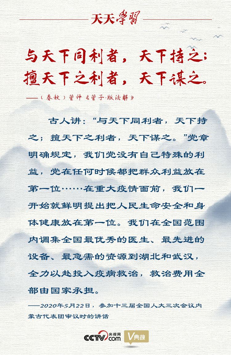 “不惜一切代價(jià)!”2020年5月22日,習(xí)近平總書記參加十三屆全國(guó)人大三次會(huì)議內(nèi)蒙古代表團(tuán)審議,在談及保護(hù)人民生命安全和身體健康時(shí)擲地有聲地說(shuō)。他在此引用了“與天下同利者,天下持之;擅天下之利者,天下謀之”這句古語(yǔ),強(qiáng)調(diào)我們黨沒(méi)有自己特殊的利益,黨在任何時(shí)候都把群眾利益放在第一位。這是我們黨作為馬克思主義政黨區(qū)別于其他政黨的顯著標(biāo)志。