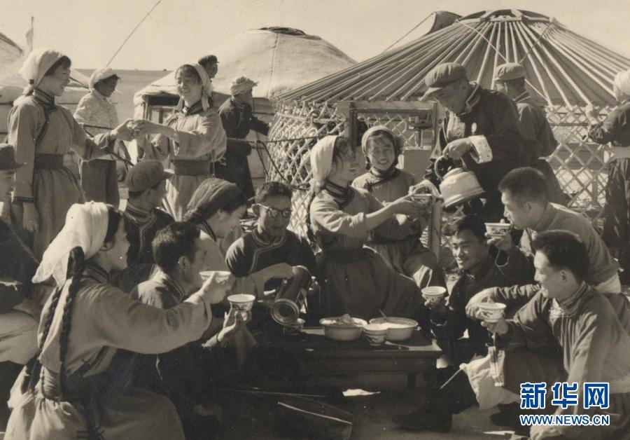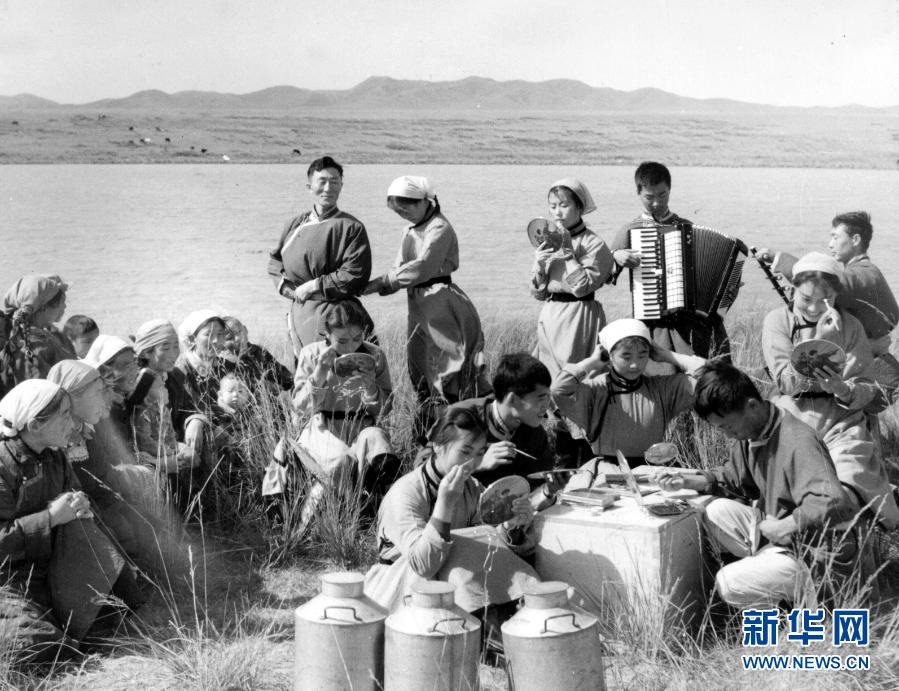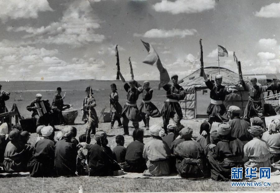 20世紀(jì)六七十年代,內(nèi)蒙古自治區(qū)錫林郭勒盟蘇尼特右旗烏蘭牧騎隊(duì)員在草原上為周邊牧民表演節(jié)目(資料照片)。新華社發(fā)