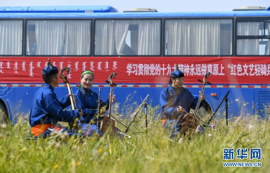 2018年9月13日,在內(nèi)蒙古自治區(qū)錫林郭勒盟鑲黃旗寶格達(dá)音高勒蘇木浩尼欽哈夏圖嘎查的一處草場,鑲黃旗烏蘭牧騎的隊(duì)員在為牧民表演文藝節(jié)目。新華社記者