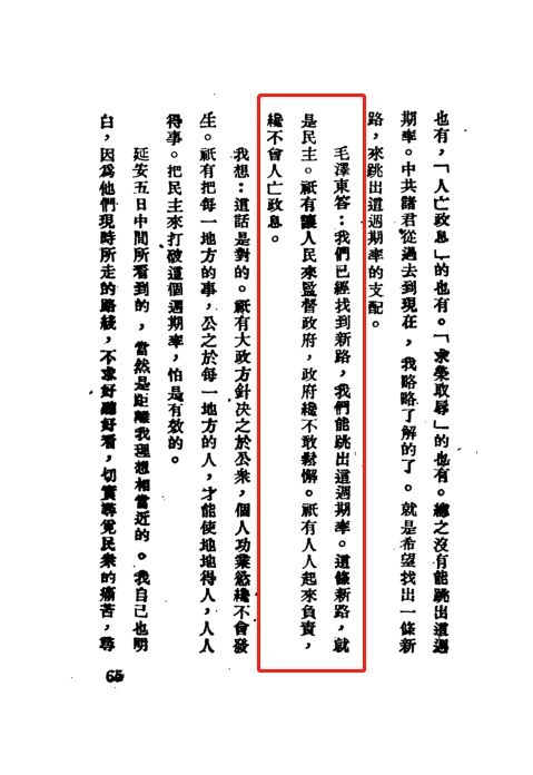 在黃炎培看來,“這話是對的”,因為“只有把每一地方的事,公之于每一地方的人,才能使地地得人,人人得事。用民主來打破這周期率,怕是有效的”。