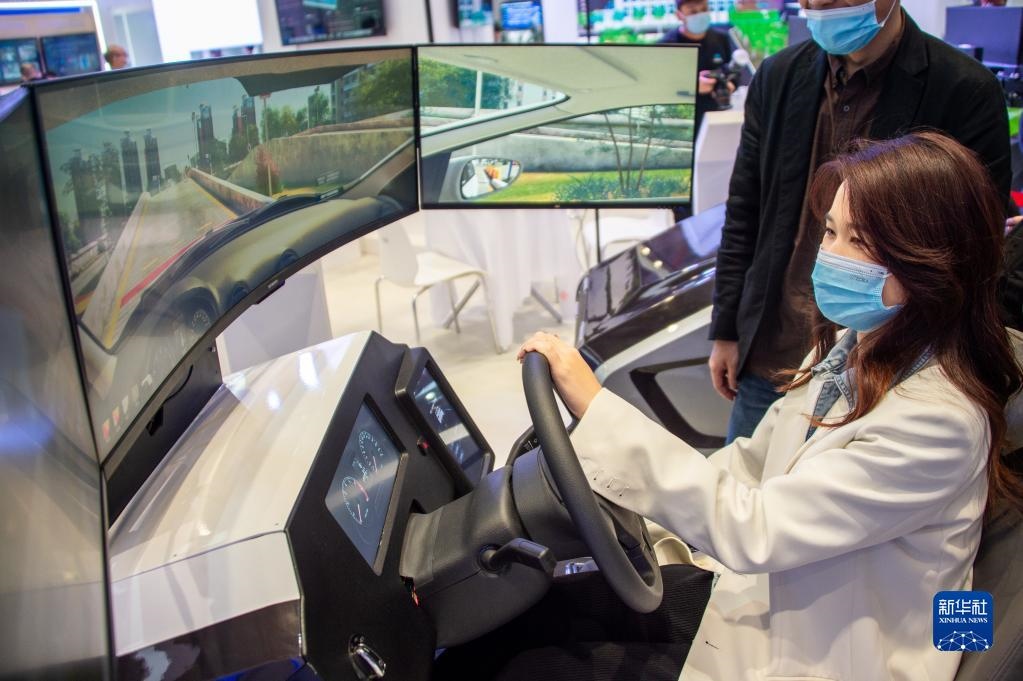 11月19日至21日,2021中國5G+工業(yè)互聯(lián)網(wǎng)大會在位于武漢的中國光谷科技會展中心舉行。這是11月19日,參觀者在“5G+工業(yè)互聯(lián)網(wǎng)成果展”上體驗駕駛智能模擬器。新華社發(fā)(伍志尊攝)