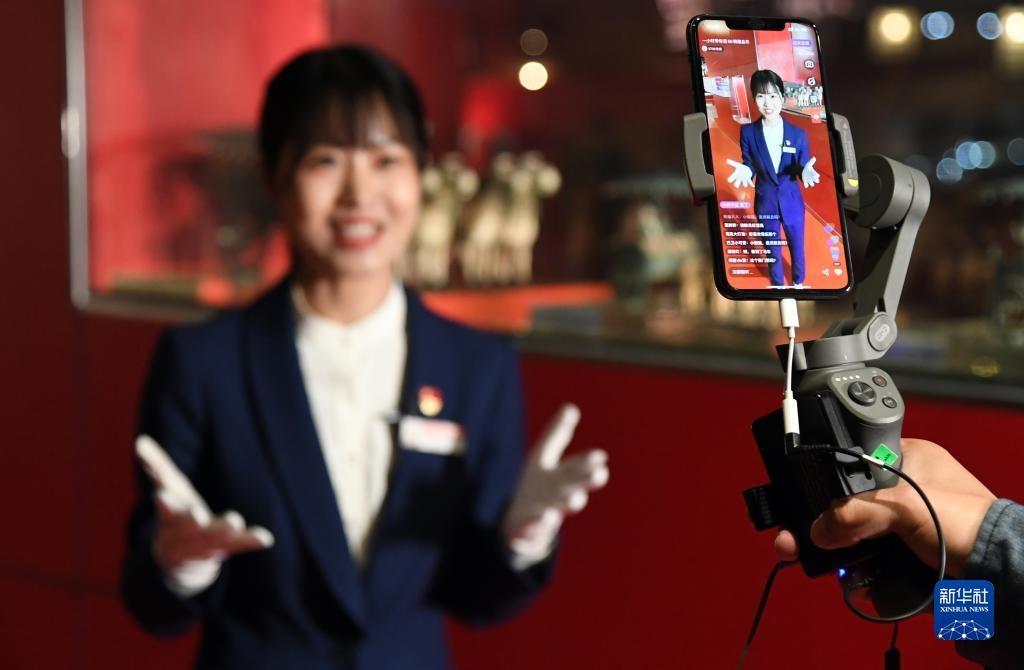 2020年4月30日,在北京汽車博物館,講解員曾紅娟通過網(wǎng)絡(luò)直播平臺為觀眾介紹館內(nèi)的藏品車。新華社記者 任超/攝
