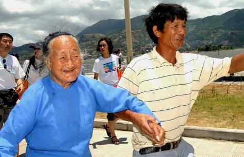 2003年7月22日,在馬祖探親的福建省連江縣83歲的張水金老人(左)和兒子(右)乘坐“閩珠二號”海上直航客輪回到福州馬尾。新華社記者 張國俊 攝