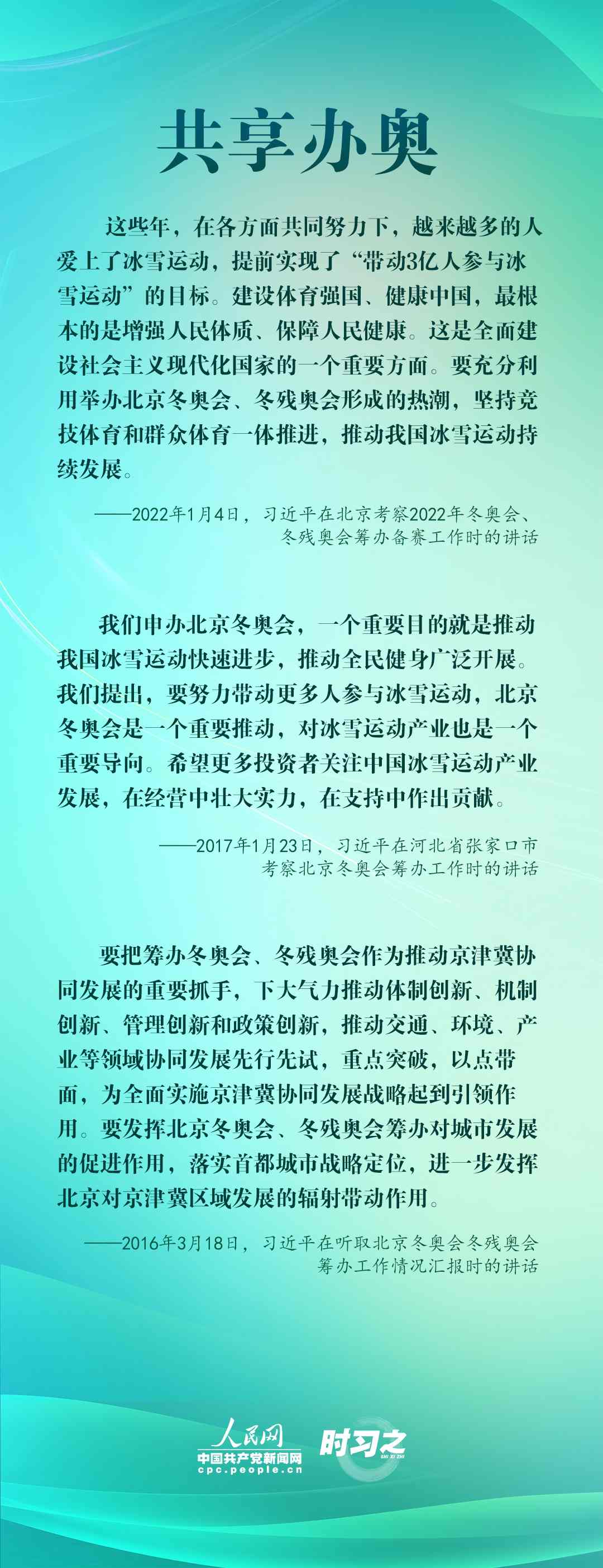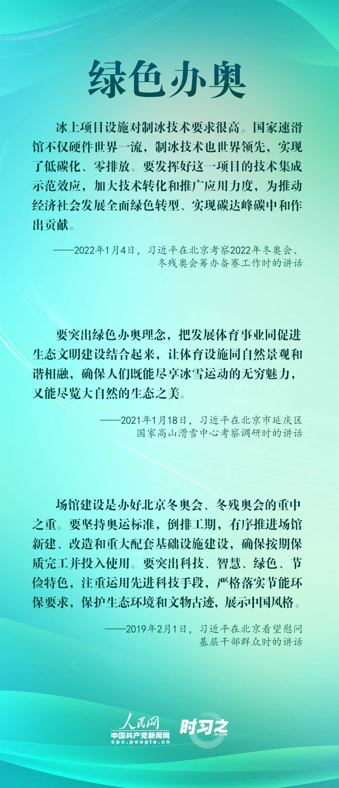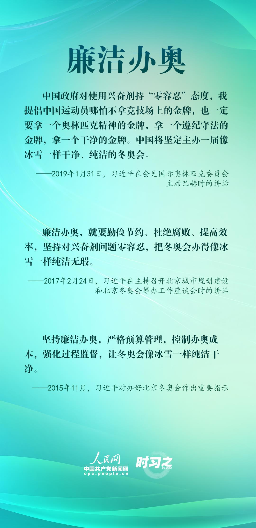 1月4日,習近平在北京考察2022年冬奧會、冬殘奧會籌辦備賽工作,指出“要堅持綠色辦奧、共享辦奧、開放辦奧、廉潔辦奧的理念,突出科技、智慧、綠色、節(jié)儉特色”。辦好北京冬奧會、冬殘奧會,是中國向國際社會作出的莊嚴承諾。習近平多次調研并強調綠色、共享、開放、廉潔的辦奧理念。