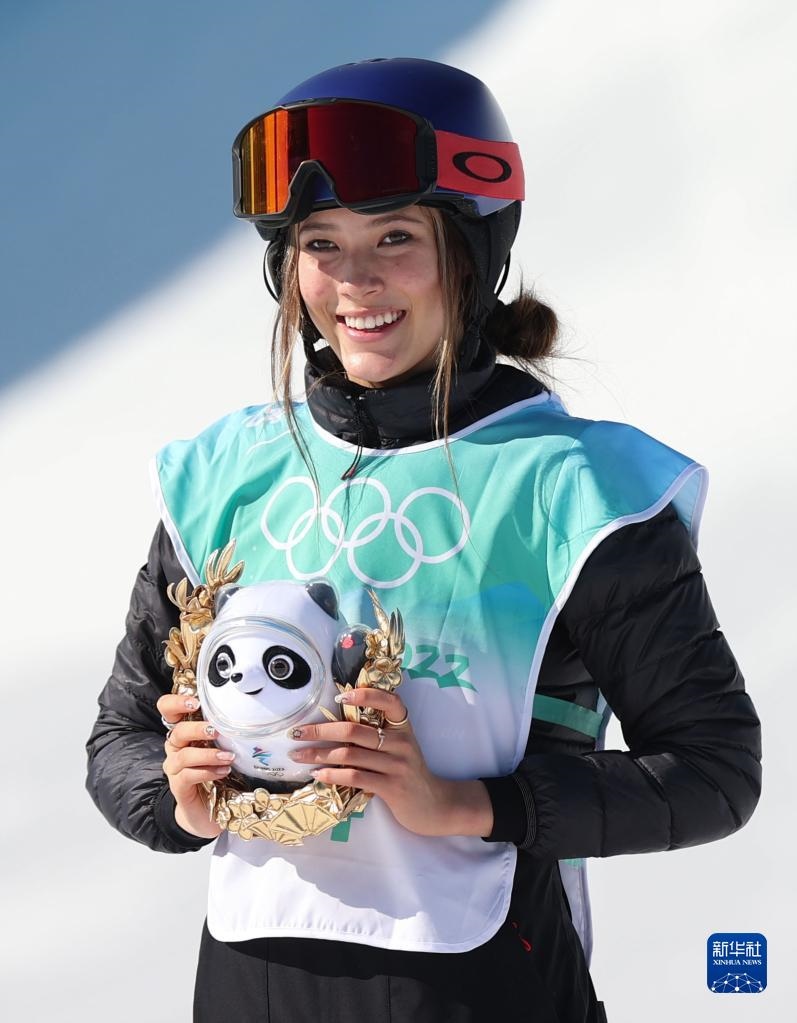 2月8日,自由式滑雪女子大跳臺(tái)比賽冠軍、中國(guó)選手谷愛(ài)凌在頒發(fā)紀(jì)念品儀式上。新華社記者 丁旭 攝