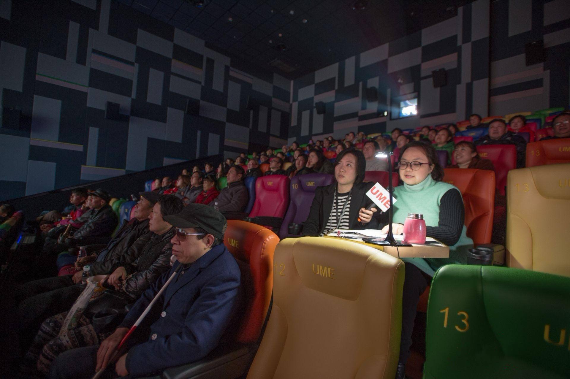 △杜誠(chéng)誠(chéng)(第二排右一)在青山一家商業(yè)影院中,為盲人居民講解正在放映的電影。