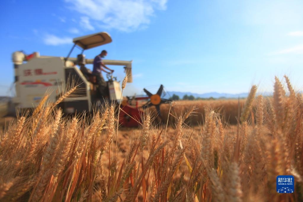 山東省臨沂市平邑縣農(nóng)民駕駛收割機在田間收獲小麥(2021年6月8日攝)。 新華社發(fā)(武紀(jì)全攝)