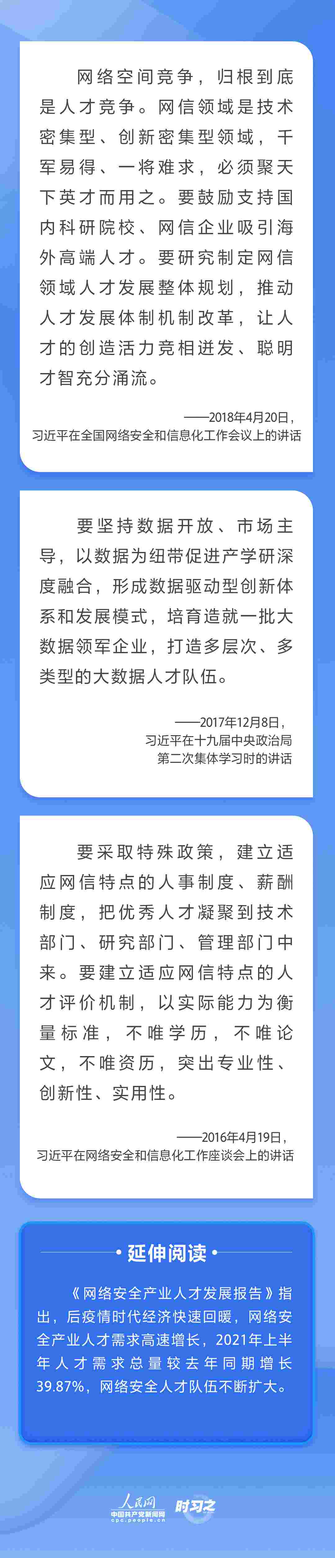 “網(wǎng)信領(lǐng)域是技術(shù)密集型、創(chuàng)新密集型領(lǐng)域,千軍易得、一將難求,必須聚天下英才而用之?!秉h的十八大以來,習近平總書記多次就網(wǎng)信事業(yè)發(fā)展作出重要論述,并將抓好人才工作擺在治國理政的重要位置,為新時代網(wǎng)信人才工作和網(wǎng)信人才事業(yè)發(fā)展指明了前進方向。