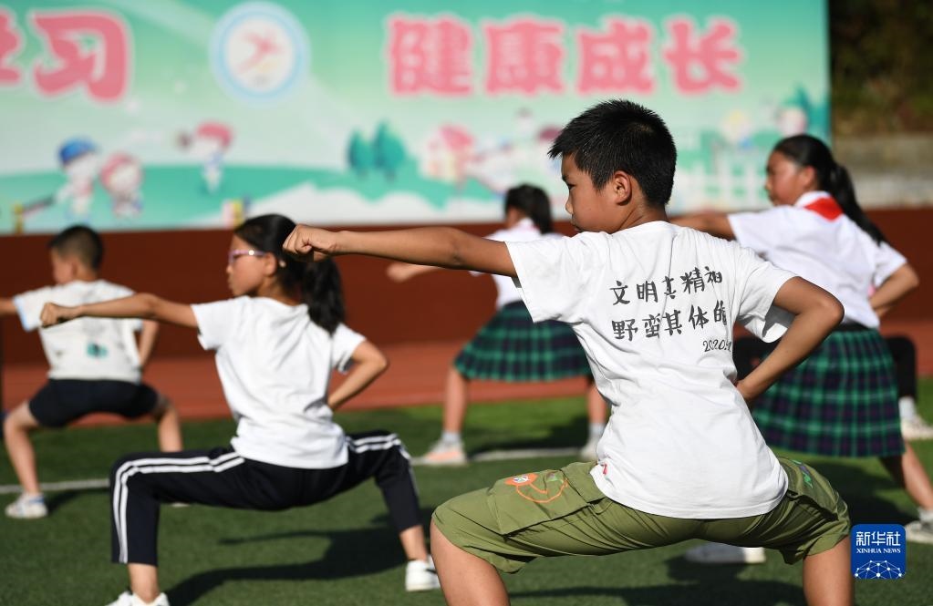 在陜西省安康市平利縣老縣鎮(zhèn)中心小學(xué)的操場(chǎng)上,學(xué)生們?cè)谡n后參加武術(shù)社團(tuán)活動(dòng)(2020年9月7日攝)。新華社記者 李一博 攝