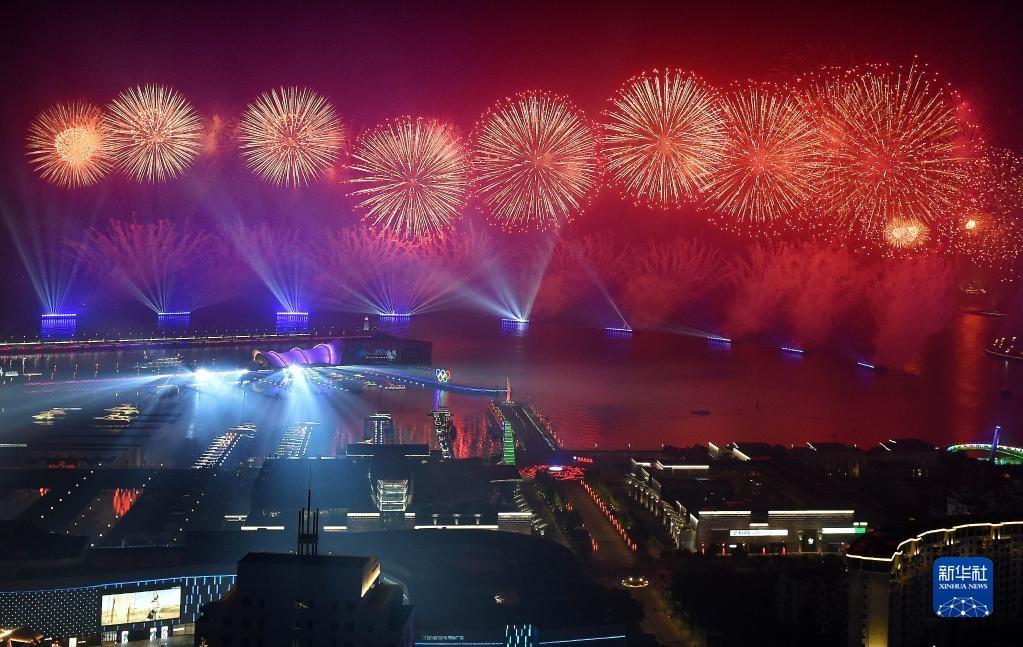 這是2018年6月9日晚在青島舉行的《有朋自遠方來》燈光焰火藝術表演。2018年6月9日至10日,上海合作組織成員國元首理事會第十八次會議在青島召開。新華社記者 李紫恒 攝