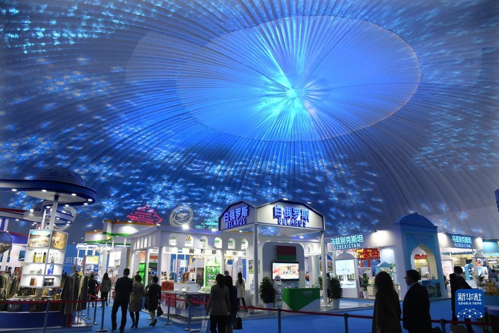與會嘉賓在各國形象館展區(qū)參觀(2021年4月26日攝)。當日,2021上海合作組織國際投資貿易博覽會暨上海合作組織地方經(jīng)貿合作青島論壇在青島開幕。新華社記者 李紫恒 攝