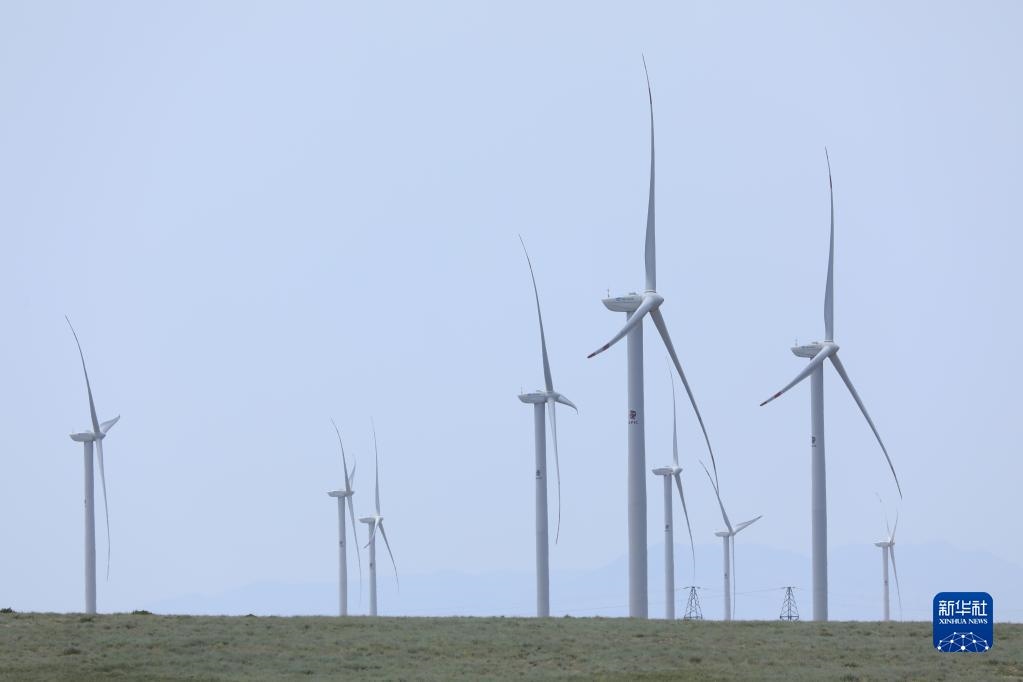 這是2021年5月24日在哈薩克斯坦扎納塔斯拍攝的風電場的風機。新華社發(fā)(奧斯潘諾夫攝)