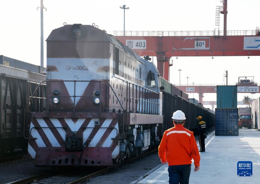 一列搭載輪胎、汽車配件、電子元件等貨物的“齊魯號”中亞班列即將發(fā)車駛出位于青島的中國-上合組織地方經(jīng)貿合作示范區(qū)青島多式聯(lián)運中心(2020年11月9日攝)。新華社記者 李紫恒 攝