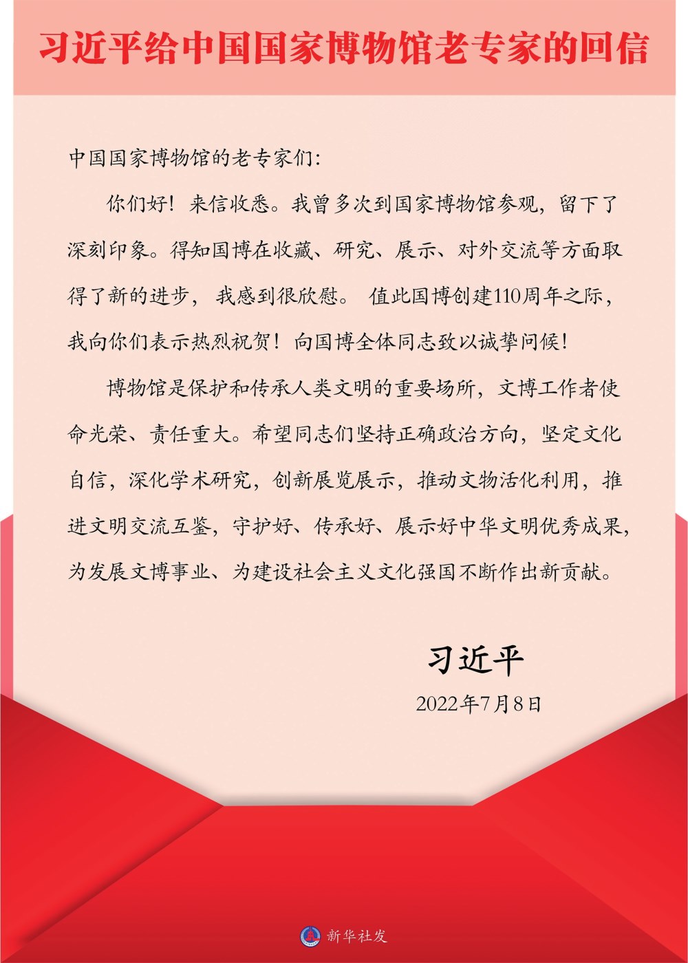 7月8日,中共中央總書(shū)記、國(guó)家主席、中央軍委主席習(xí)近平給中國(guó)國(guó)家博物館的老專家回信,在國(guó)博創(chuàng)建110周年之際,向國(guó)博全體同志致以熱烈祝賀和誠(chéng)摯問(wèn)候。