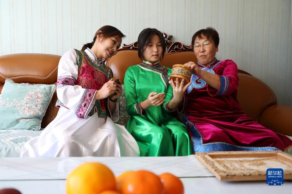 10月17日,內(nèi)蒙古莫力達(dá)瓦達(dá)斡爾族自治旗布西社區(qū)居民杜文娟(左)和家人在一起。新華社記者 鄒儉樸 攝