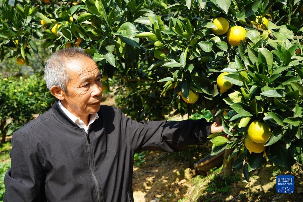 10月16日,全國(guó)脫貧攻堅(jiān)楷模、重慶市巫山縣下莊村黨支部書記毛相林在自家柑橘園中查看柑橘長(zhǎng)勢(shì)。新華社記者 李曉婷 攝