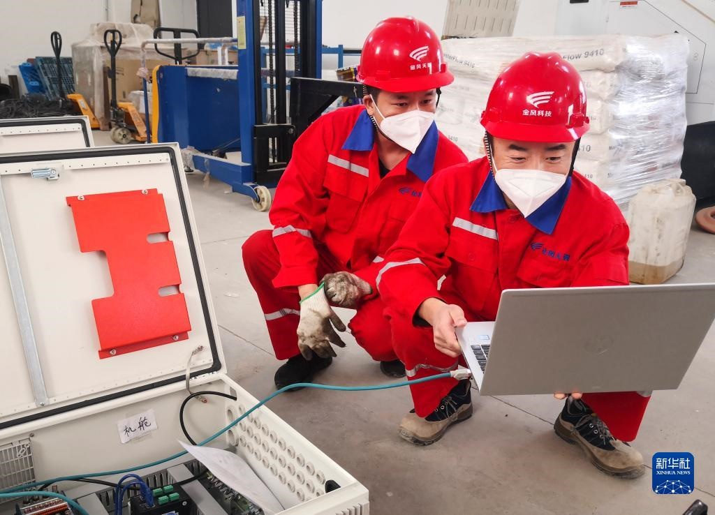 10月16日,在新疆烏魯木齊金風(fēng)科技天翼達(dá)坂城試驗(yàn)風(fēng)電場(chǎng),場(chǎng)長(zhǎng)張新旺(右)和同事一起工作。新華社發(fā)(周凱 攝)
