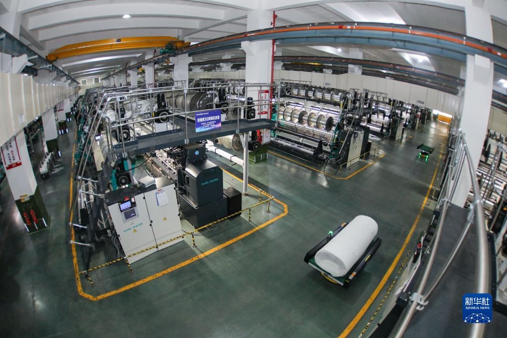 福建晉江,華宇錚鎣集團(tuán)第五經(jīng)編車間內(nèi),一排排經(jīng)編機(jī)正在高速運(yùn)轉(zhuǎn),AGV物流機(jī)器人不停穿梭其中。