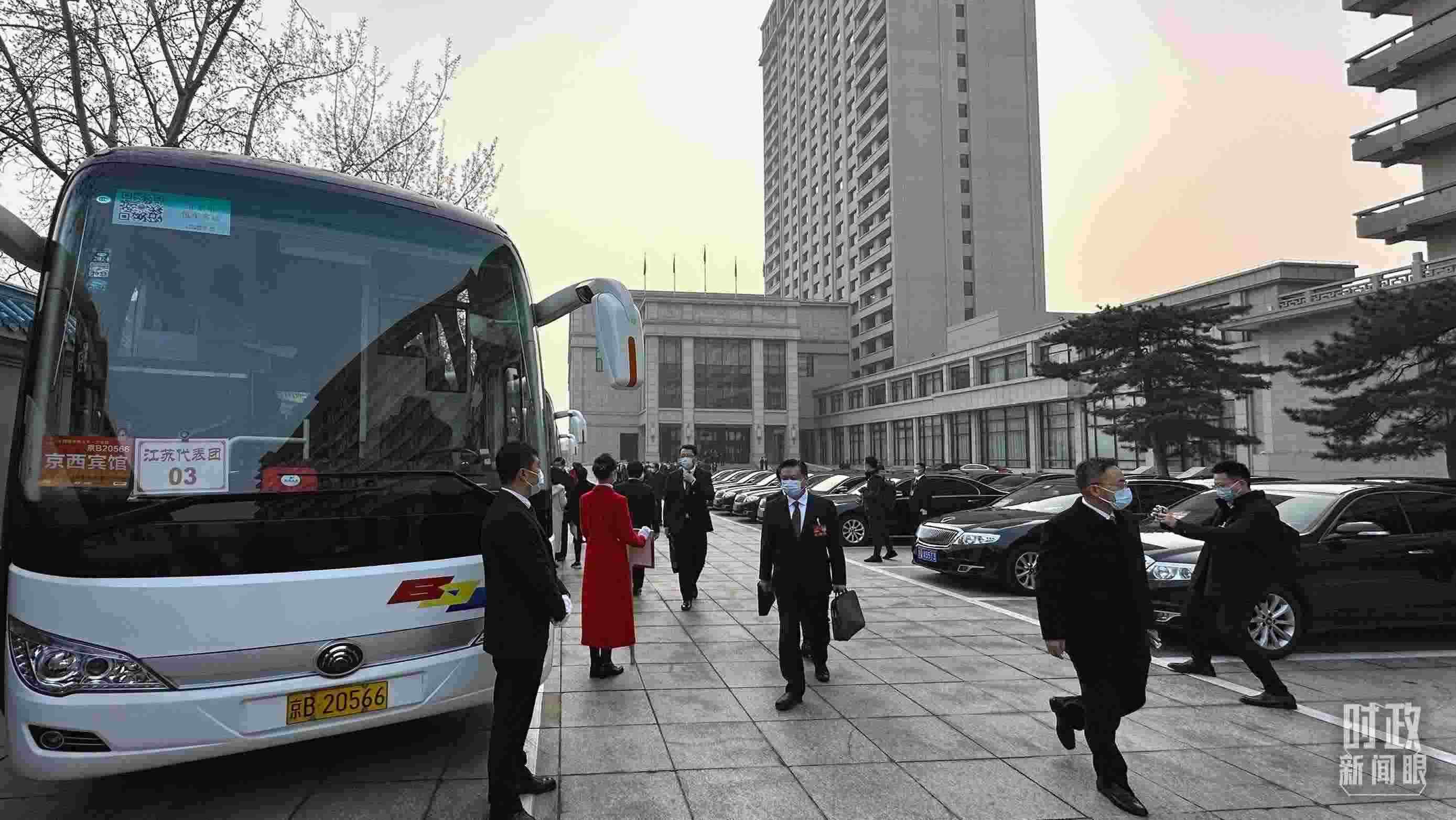 △2023年3月5日,江蘇代表團(tuán)乘車前往人民大會(huì)堂。(江蘇省廣播電視總臺(tái)記者 周明、張正拍攝)