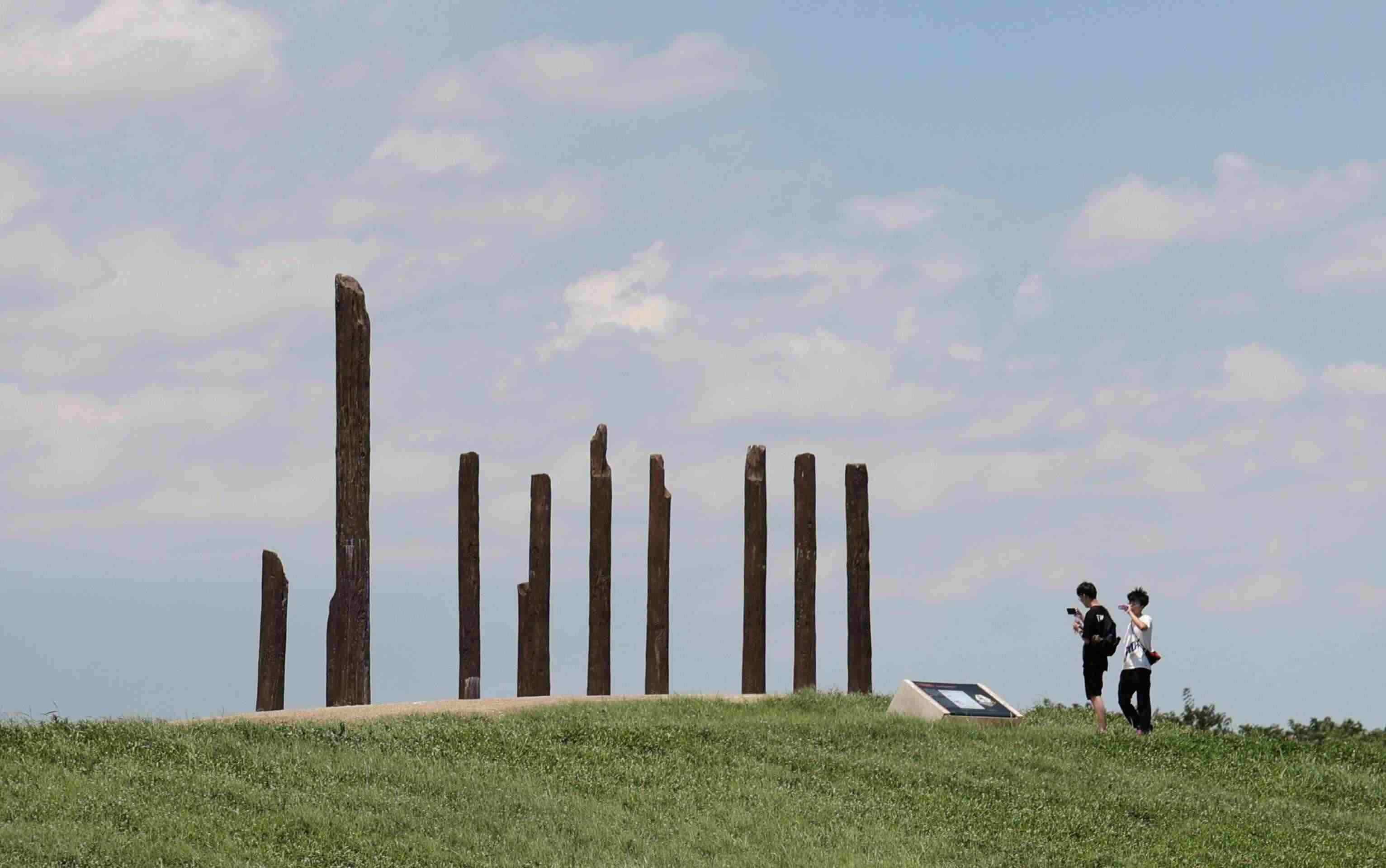 △游客在良渚古城遺址公園參觀莫角山遺址。