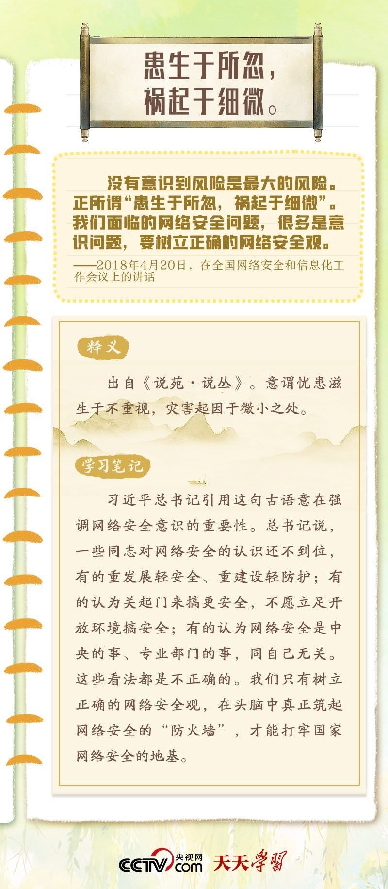 習(xí)近平總書記重視網(wǎng)絡(luò)安全工作,曾多次在講話中以典明理,深刻闡釋網(wǎng)絡(luò)安全工作的重要意義?!熬W(wǎng)絡(luò)安全宣傳周”到來之際,央視網(wǎng)《天天學(xué)習(xí)》特梳理總書記關(guān)于網(wǎng)絡(luò)安全的用典,與您一起學(xué)習(xí)領(lǐng)悟。