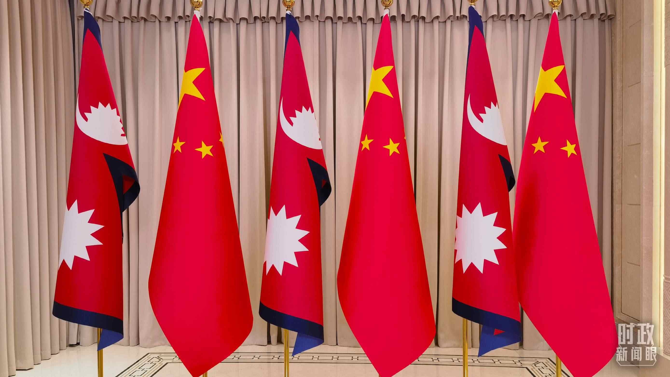 △會(huì)見現(xiàn)場擺放的中國、尼泊爾國旗。(總臺(tái)央視記者周志國拍攝)